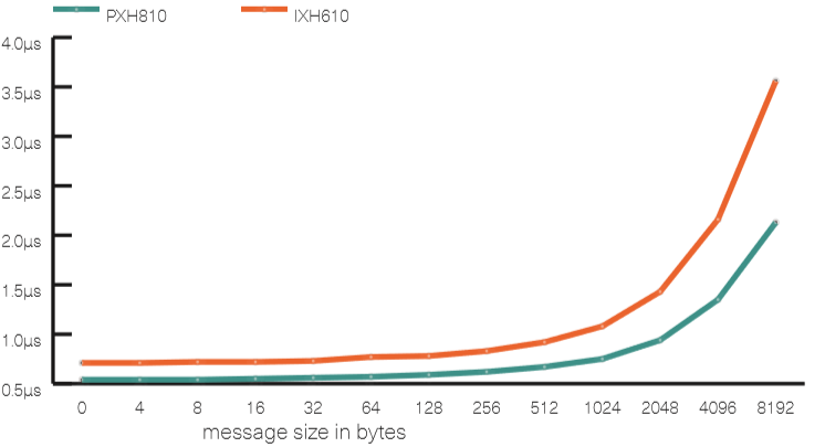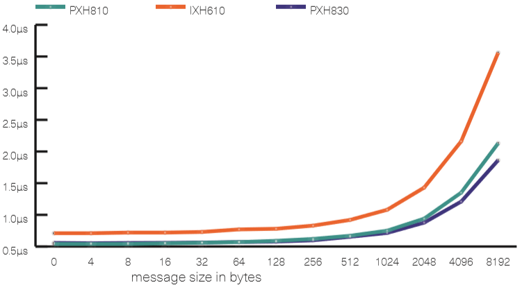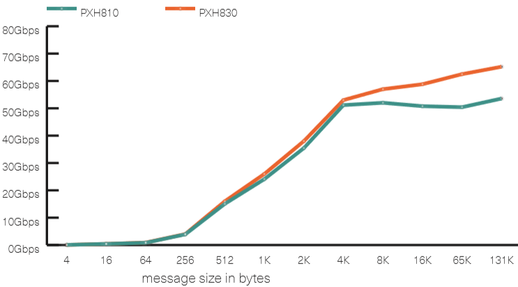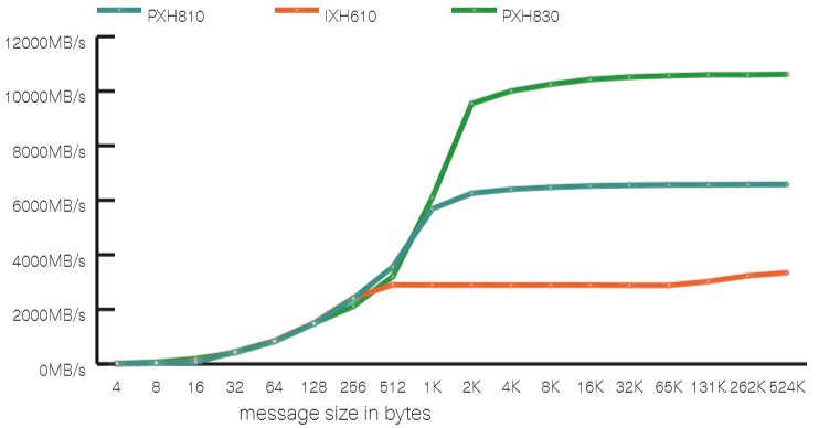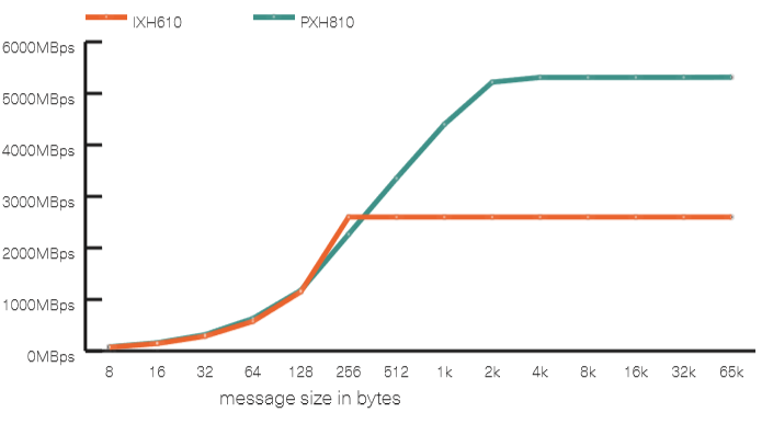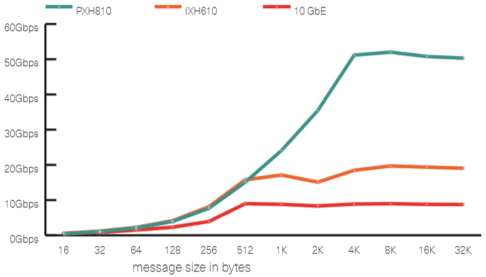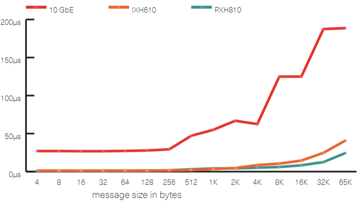 PCI Express ソリューションは、レイテンシとスループットの他の相互接続に比べて優れたパフォーマンスを提供します。標準の 10 Gb/秒イーサネットと比較すると、PCI Express の待ち時間は測定された待ち時間の1/10 です。この低レイテンシは、特別なチューニングや複雑な最適化スキームなしで実現されます。現在のソリューションは、540nsでメモリからメモリへのアクセスを開始するレイテンシを提供します。