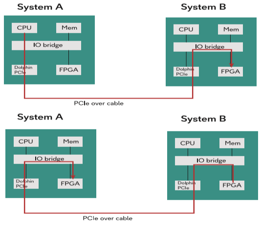 PCIe ピアツーピア通信 (P2P) は PCIExpress 仕様の一部であり、通常の PCIe デバイスは、メインメモリを一時ストレージとして使用せずに直接データ転送を行ったり、CPUを介さずデータ移動することができます。 これにより、通信待ち時間が大幅に短縮されます。 PCIe ファブリックは、リモートシステムが P2P 通信を確立できるようにすることで、この機能を拡張します。 インテルPhi、GPU、FPGA、特殊なデータフレームグラバは、リモート P2P 通信を利用して、待ち時間と通信オーバーヘッドを削減することができます。