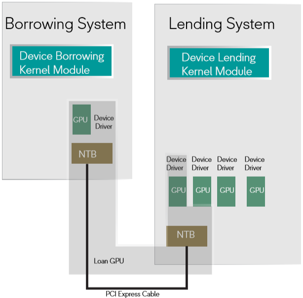 PCIe デバイスレンディングは、PCIe ファブリック内で PCIe I/O デバイス (NVMes、FPGA、GPU など) にアクセスできるようにするための柔軟な方法を提供します。PCIe の速度でソフトウェアのオーバーヘッドがなくても、PCIe ファブリック上でデバイスを借りることができます。 デバイスの貸出は、システムを再構成し、リソースを再度割り当て直す簡単な方法です。GPU、NVMe ドライブ、または FPGA は、ファブリック内のどのシステムからでも論理的に追加できます。その結果、使用法を最大限に活用するデバイスのプールを作成するための柔軟な方法です。 このソリューションでは標準の PCIe を使用しているため、通信パスにソフトウェアのオーバーヘッドは追加されません。標準の PCIe トランザクションは、システム間で使用されます。Dolphin社 eXpressWare ソフトウェアは、接続を管理し、PCIe 非透過ブリッジ (NTB) マッピングを設定します。