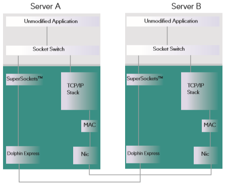 PCIExpress は、ローカルイーサネットネットワークを高速の低レイテンシネットワークに置き換えることができます。 SuperSocketsは、バークレーソケット API のユニークな実装です。SuperSocketsを使用すると、ネットワークアプリケーションは PCIe トランスポートを透過的に活用してパフォーマンスの向上を実現します。 Dolphin社 PCIe ハードウェアと SuperSocketsソフトウェアは、超低レイテンシ、高帯域幅、低オーバーヘッド、高可用性プラットフォームを備えた最も要求の厳しいソケットベースのアプリケーションをサポートします。新規および既存の Linux および Windows アプリケーションは、変更をすることなくDolphin社の高性能プラットフォームで使用することができます。